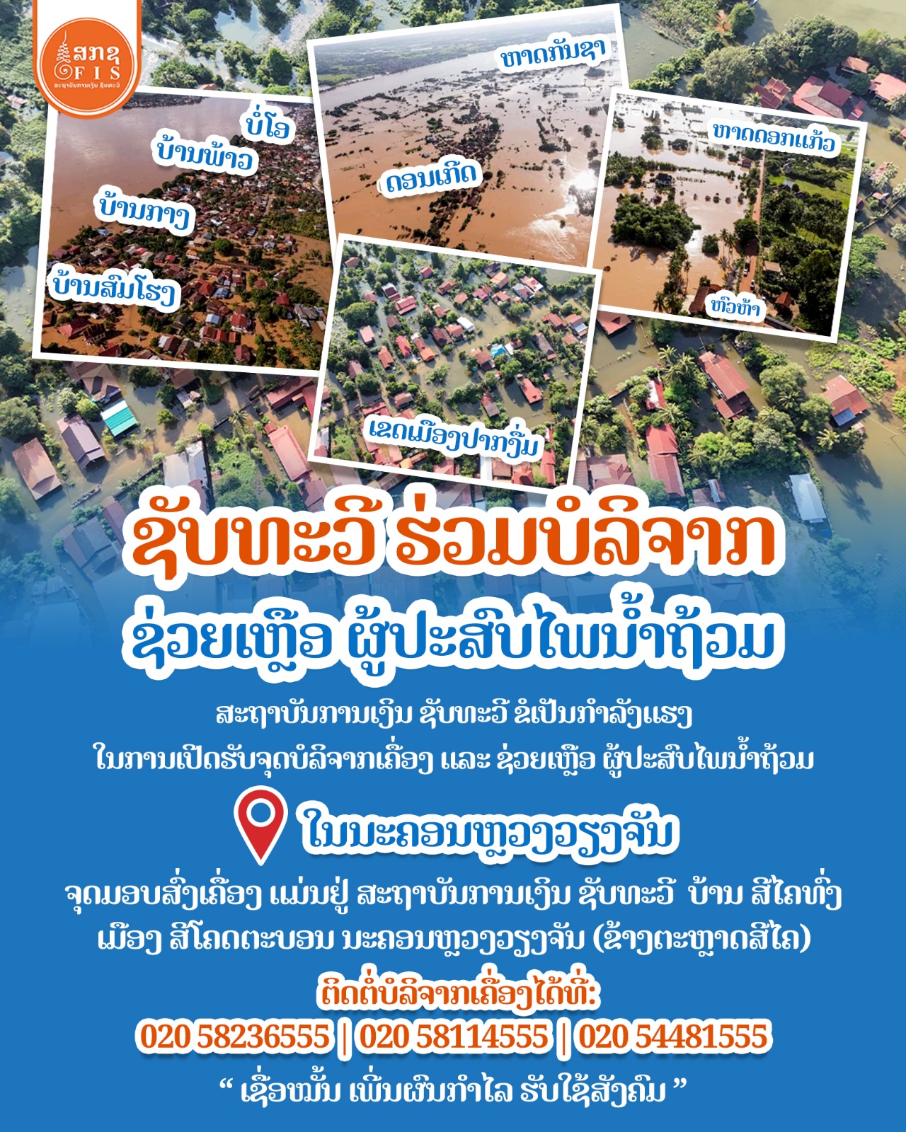 ເນື່ອງຈາກສະຖານະການນ້ຳຖ້ວມ ເຂດບ້ານໄຮ່ ເມືອງປາກງື່ມ ແຂວງນະຄອນຫຼວງວຽງຈັນ ໄດ້ຮັບຄວາມເສຍຫາຍໜັກສົມຄວນ ສະນັ້ນ ສຳລັບທ່ານໃດ ຢາກສົມທົບ ວັດຖຸ ສິ່ງຂອງ ເຂົ້າ ສານ ອາຫານແຫ້ງ. ຊັບທະວີ ຂໍເປັນກຳລັງແຮງ ຫຼື ເປັນສື່ກາງສະພານບຸນຮ່ວມ ໃນການເປີດຮັບຈຸດບໍລິຈາກເຄື່ອງ ແລະ ຊ່ວຍເຫຼືອຜູ້ປະສົບໄພນ້ຳຖ້ວມ