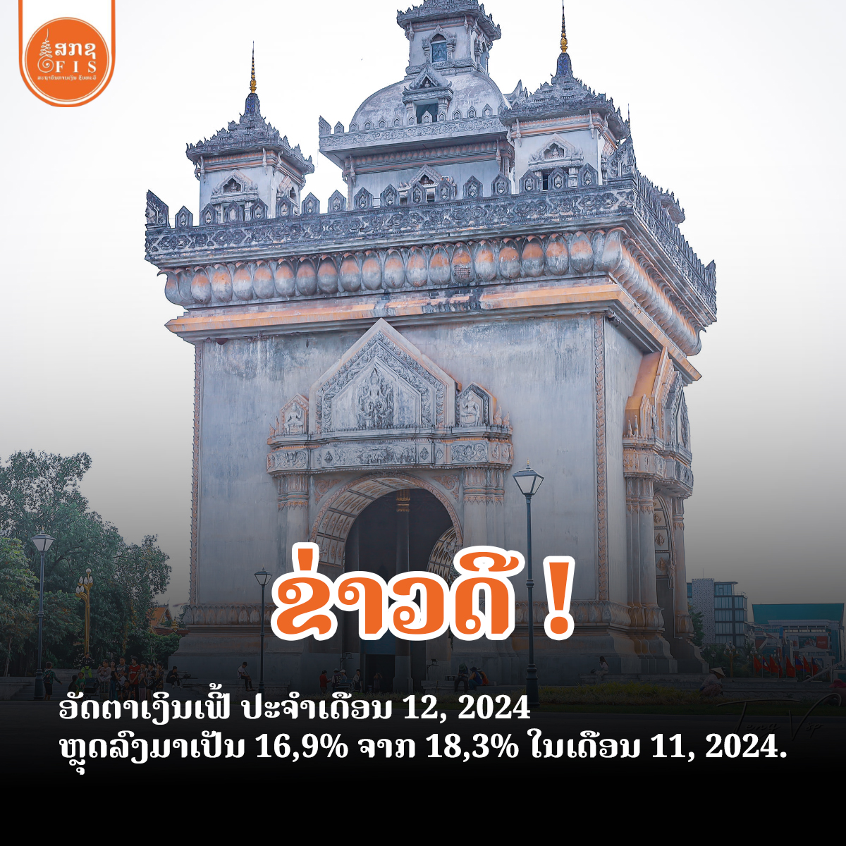 By admin1 sapthavy / 02/01/2025 ຂ່າວດີ ອັດຕາເງິນເຟີ້ຢູ່ ສປປ ລາວ ປະຈຳເດືອນ ທັນວາ 2024 ຫຼຸດລົງເຫຼືອ 16,9% ຈາກ 18,3% ໃນເດືອນ ພະຈິກ 2024.