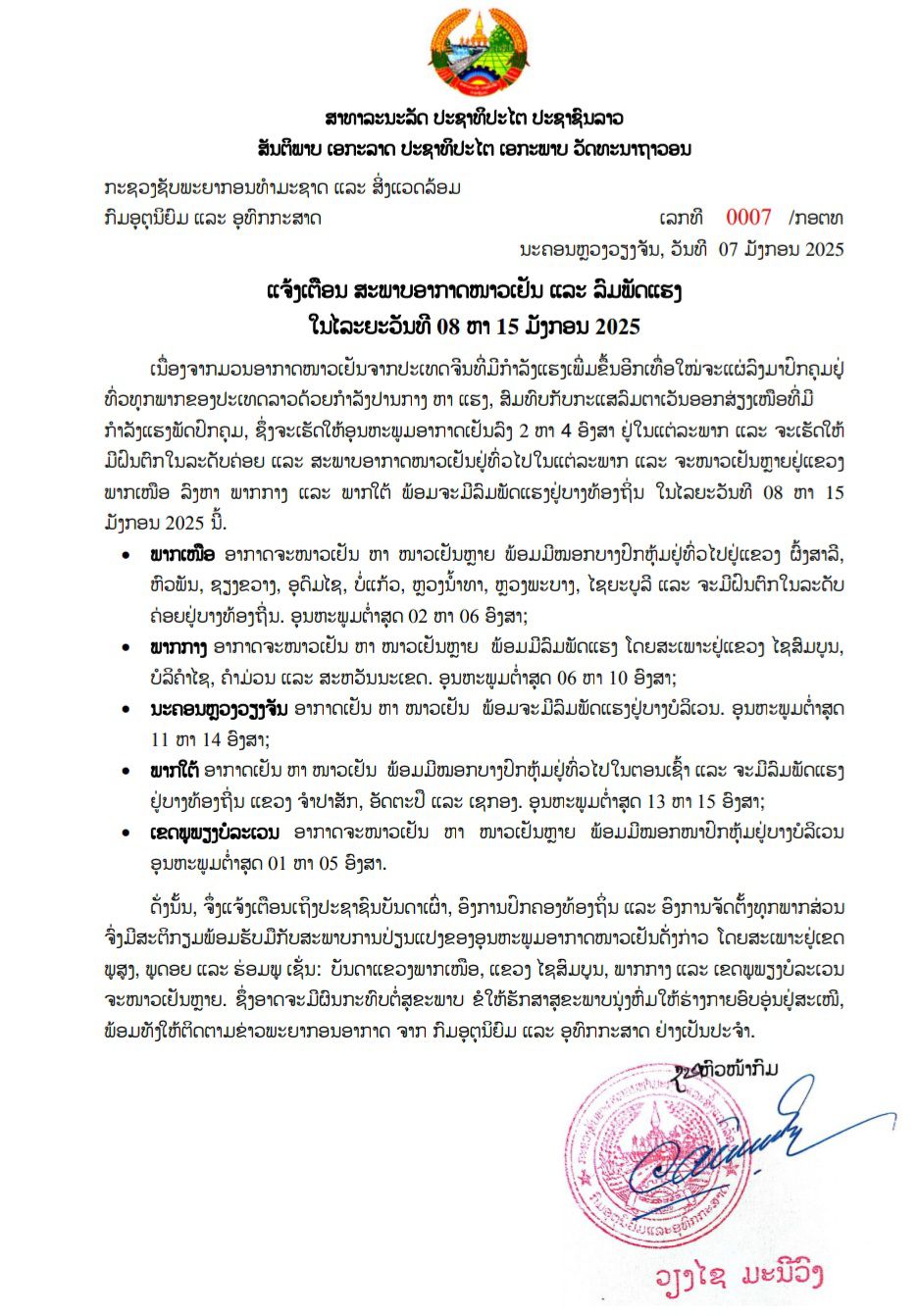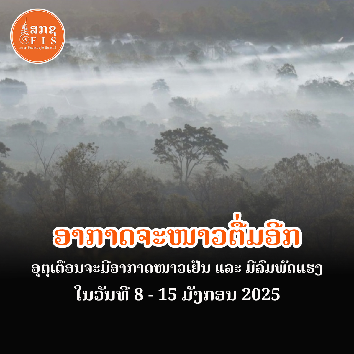 By admin1 sapthavy / 08/01/2025 ອຸຕຸເຕືອນອາກາດໜາວເຢັນ-ລົມພັດແຮງ ໄລຍະວັນທີ 8-15/01/2025 ອີງຕາມແຈ້ງການຂອງກົມອຸຕຸນິຍົມ ແລະ ອຸທົກກະສາດລົງເມື່ອວັນທີ 7 ມັງກອນ 2025 ກ່ຽວກັບແຈ້ງເຕືອນອາກາດໜາວເຢັນ ພ້ອມມີລົມພັດແຮງ ວັນທີ 8-15/01/2025, ເຊິ່ງຈະເຮັດໃຫ້ອຸນຫະພູມເຢັນລົງ 2-4 ອົງສາຢູ່ໃນແຕ່ລະພາກ.