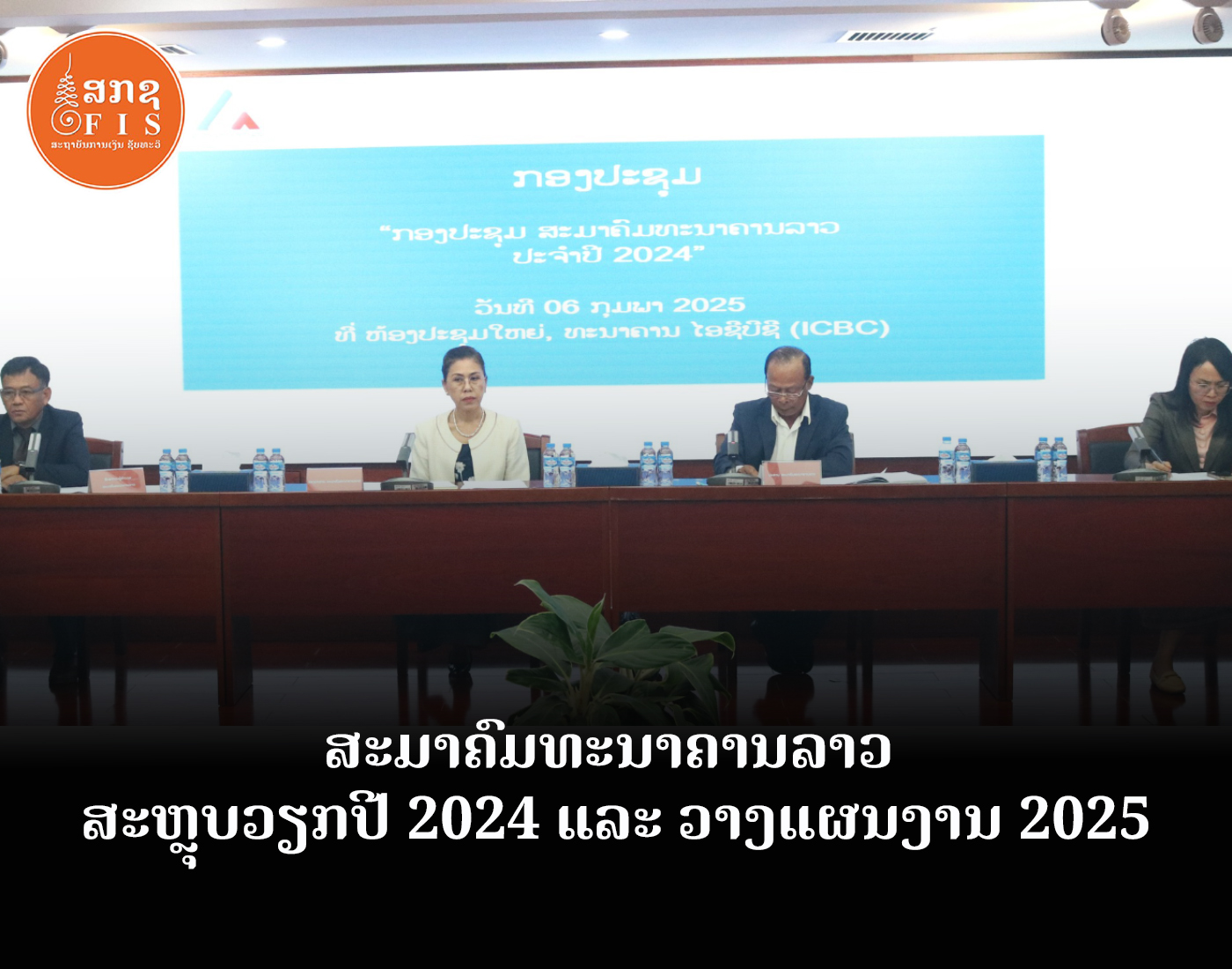 ສະມາຄົມທະນາຄານ ລາວ (ສມຄ) ໄດ້ກອງປະຊຸມ ໃນວັນທີ 6 ກຸມພາ 2025 ທີ່ ຫ້ອງປະຊຸມໃຫຍ່ ທະນາຄານ ICBC ສາຂານະຄອນຫລວງ ເພື່ອສະຫລູບຜົນການເຄືີ່ອນໄຫວວຽກງານ ປະຈຳປີ 2024 ແລະ ຜ່ານ ແຜນດຳເນີນງານໃນປີ 2025 ໂດຍການເປັນປະທານ ຂອງ ທ່ານ ພຸດທະໄຊ ສິວິໄລ ປະທານ ສະມາຄົມທະນາຄານລາວ;