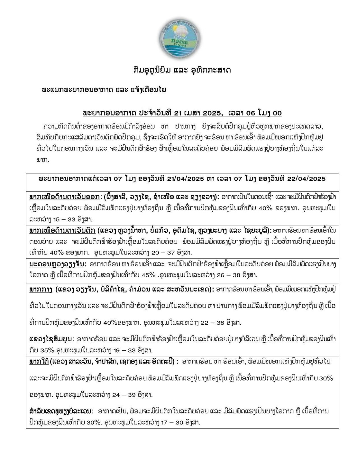ພະຍາກອນອາກາດ ເຊົ້າວັນທີ 21 ເມສາ 2025 ຄວາມກົດດັນຕໍ່າຂອງອາກາດຮ້ອນມີກໍາລັງອ່ອນ ຫາ ປານກາງ ຍັງຈະສືບຕໍ່ປົກຄຸມຢູ່ທົ່ວທຸກພາກຂອງປະເທດລາວ, ສົມທົບກັບກະແສລົມ ຕາເວັນຕົກພັດປົກຄຸມ, ຊຶ່ງຈະເຮັດໃຫ້ອາກາດຍັງຈະຮ້ອນ ຫາ ຮ້ອນເອົ້າ ພ້ອມມີໝອກແຫ້ງປົກຫຸ້ມຢູ່ທົ່ວໄປໃນຕອນກາງເວັນ ແລະ ຈະມີຝົນຕົກ ຟ້າຮ້ອງ ຟ້າເຫຼື້ອມໃນລະດັບຄ່ອຍ ພ້ອມມີລົມພັດແຮງຢູ່ບາງທ້ອງຖິ່ນ ໃນແຕ່ລະພາກ.