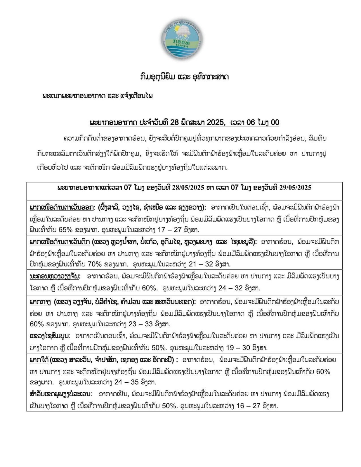 ພະຍາກອນອາກາດ ວັນທີ 28 ພຶດສະພາ 2025 ຄວາມກົດດັນຕໍ່າຂອງອາກາດຮ້ອນ, ຍັງຈະສືບຕໍ່ປົກຄຸມຢູ່ທົ່ວທຸກພາກ ຂອງປະເທດລາວ ດ້ວຍກໍາລັງອ່ອນ, ສົມທົບກັບກະແສລົມຕາເວັນຕົກ ສ່ຽງໃຕ້ພັດປົກຄຸມ, ຊຶ່ງຈະເຮັດໃຫ້ ຈະມີຝົນຕົກ ຟ້າຮ້ອງ ຟ້າເຫຼື້ອມ ໃນລະດັບຄ່ອຍ ຫາ ປານກາງຢູ່ເກືອບທົ່ວໄປ ແລະ ຈະຕົກໜັກ ພ້ອມມີລົມພັດແຮງຢູ່ບາງທ້ອງຖິ່ນໃນແຕ່ລະພາກ.