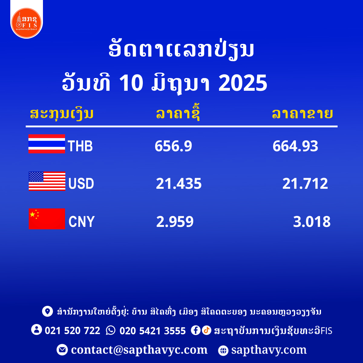 ອັດຕາແລກປ່ຽນວັນທີ 04 ມິຖຸນາ 2025