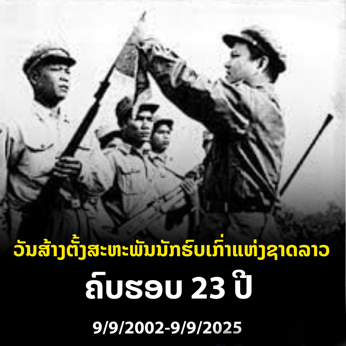 ຄົບຮອບ 23 ປີ ວັນທີ 9 ກັນຍາ 2002-9 ກັນຍາ 2025 ວັນສ້າງຕັ້ງສະຫະພັນນັກຮົບເກົ່າແຫ່ງຊາດລາວ ເພື່ອເປັນການລະນຶກເຖິງຄຸນງາມຄວາມດີ ຂອງ ບັນພະບຸລຸດລາວ ທີ່ໄດ້ອຸທິດຊີວິດ ແລະ ເລືອດເນື້ອເພື່ອຕໍ່ສູ້ຍາດເອົາເອກະລາດ,ອະທິປະໄຕ ແລະ ຜືນແຜ່ນດິນອັນຄົບຖ້ວນມາສູ່ຊາດລາວທັງເປັນການເຊື່ອມຊືມ ເຝິກຜົນຫລໍ່ຫລອມຕົນເອງ ໃນການສຶກສາຮໍ່າຮຽນ ເອົາຄຸນທາດການເມືອງ ແລະ ຄຸນສົມບັດສິນທໍາປະຕິວັດຂອງນັກຮົບໃນການຕໍ່ສູ້ຢ່າງອົງອາດກ້າຫານ ມີນໍ້າໃຈຮັກຊາດອັນສູງສົ່ງ ຕໍ່ສູ້ບໍ່ຍອມຈໍານົນຈົນສາມາດຍາດໄດ້ໄຊຊະນະ ອັນຍິ່ງໃຫຍ່ ແລະ ສະຖາປະນາປະເທດຊາດໄດ້ຢ່າງສົມກຽດ.