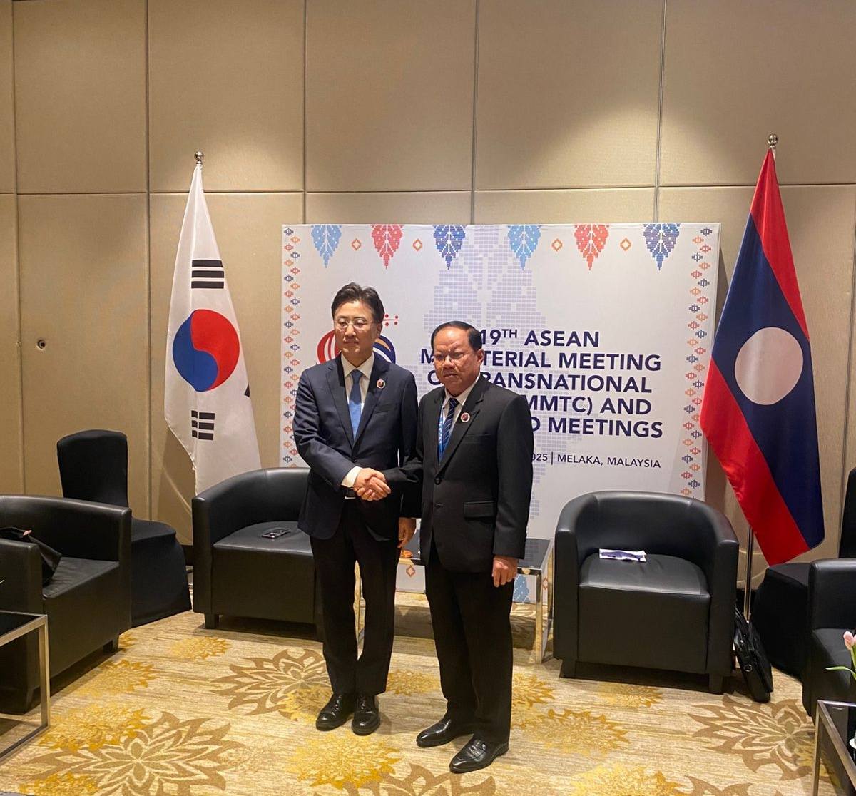 ຄະນະຜູ້ແທນຂັ້ນສູງກະຊວງປ້ອງກັນຄວາມສະຫງົບ ສປປ ລາວ, ນໍາໂດຍ ພົນໂທ ຄໍາກິ່ງ ຜຸຍຫລ້າມະນີວົງ ຮອງລັດຖະມົນຕີກະຊວງປ້ອງກັນຄວາມສະຫງົບ ໄດ້ເຂົ້າຮ່ວມກອງປະຊຸມລັດ ຖະມົນຕີອາຊຽນວ່າດ້ວຍການຕ້ານອາຊະຍາກໍາຂ້າມຊາດ ຄັ້ງທີ 19 ແລະ ກອງປະຊຸມອື່ນໆທີ່ກ່ຽວຂ້ອງ (19th AMMTC and Its Related Meetings) ທີ່ຈັດຂຶ້ນໃນລະຫວ່າງ ວັນທີ 9 – 11 ກັນຍາ 2025 ທີ່ ມາລັກກາ ປະເທດ ມາເລເຊຍ.