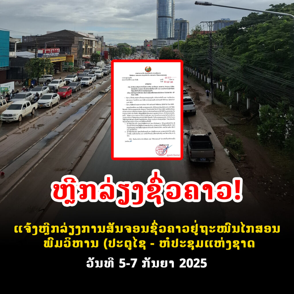 ແຈ້ງຫຼີກລ່ຽງການສັນຈອນຊົ່ວຄາວ ຢູ່ຖະໜົນໄກສອນພົມວິຫານ (ປະຕູໄຊ-ຫໍປະຊຸມແຫ່ງຊາດ) ວັນທີ 5-7 ກັນຍາ 2025 ພະແນກໂຍທາທິການ ແລະ ຂົນສົ່ງ ນະຄອນຫຼວງວຽງຈັນ ຂໍຖືເປັນກຽດແຈ້ງມາຍັງບັນດາທ່ານ ຜູ້ນໍາໃຊ້ລົດ ໃຊ້ຖະຫນົນ ໃນທົ່ວນະຄອນຫຼວງວຽງຈັນ ຮັບຊາບວ່າ ໃນລະຫວ່າງວັນທີ 05-07 ກັນຍາ 2025