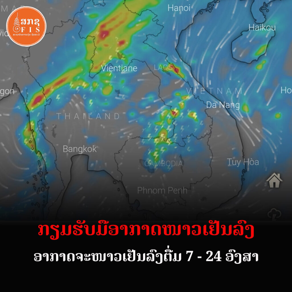 ພະຍາກອນອາກາດແຕ່ເວລາ 07 ໂມງ ຂອງວັນທີ 27/01/2025 ຫາ ເວລາ 07 ໂມງ ຂອງວັນທີ 28/01/2025 ພາກເຫນືອດ້ານຕາເວັນອອກ: (ຜົ້ງສາລີ, ວຽງໄຊ, ຊໍາເຫນືອ ແລະ ຊຽງຂວາງ) ອາກາດຈະຫນາວເຢັນຫຼາຍລົງຕື່ມອີກ ພ້ອມມີຫມອກຫນາ ປົກຫຸ້ມຢູ່ທົ່ວໄປ